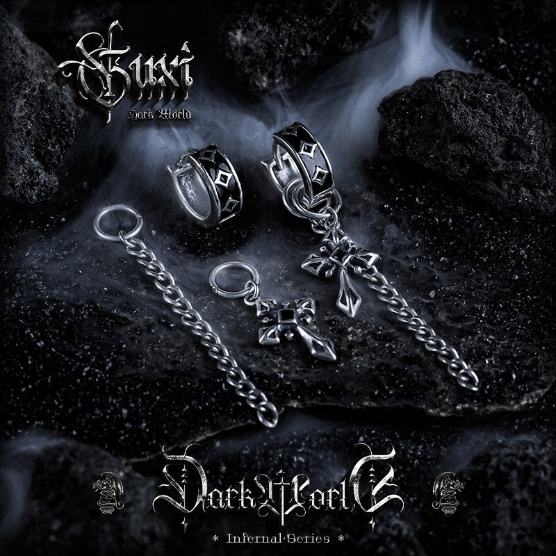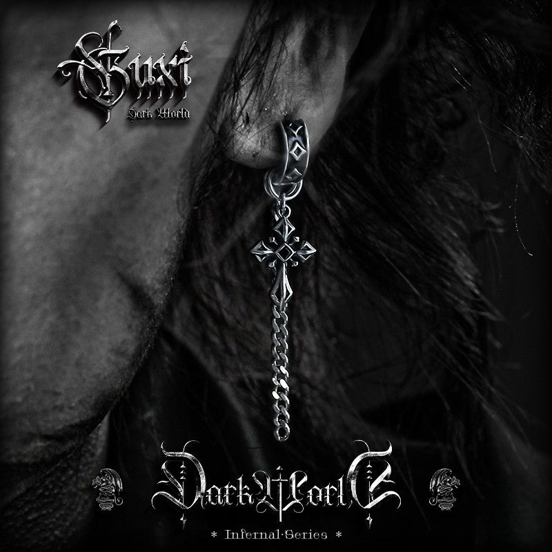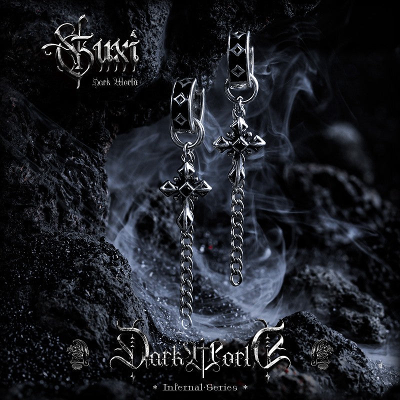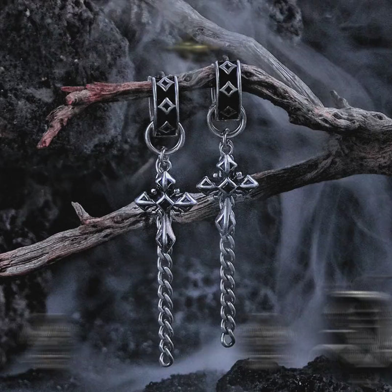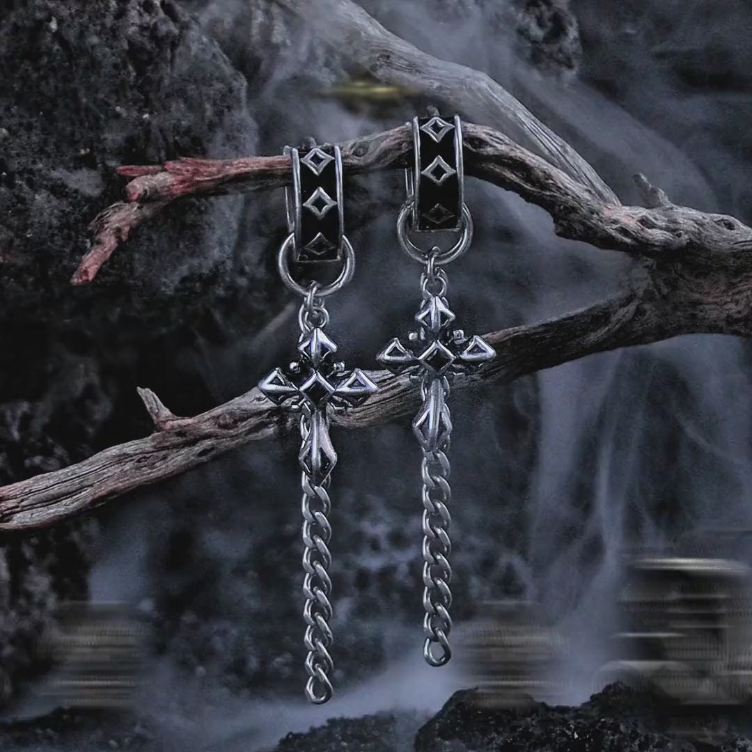 Long chain earrings with gothic cross pendants. Not studs. Not hoops. These are decorative tops with chains that dangle—ending in detailed 3D cross charms. Real 925 sterling silver. For people who want earrings that move and make a statement.