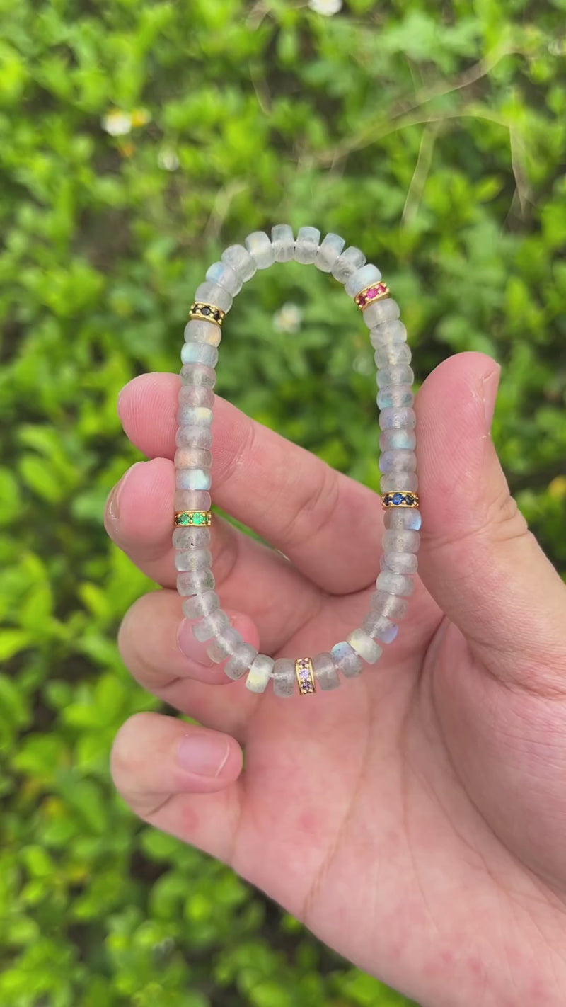 Each 6mm bead is precision-cut and hand-polished to perfection, with subtle flashes of blue and silver light (adularescence) that shimmer as you move. The bracelet is accented with fine silver-toned inlays, designed for harmony and balance, evoking a sense of calm protection that accompanies you through daily life.