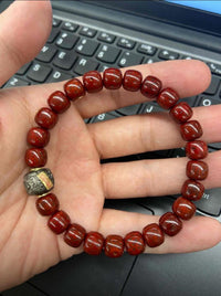 This bracelet is crafted from premium 8mm Nanhong red agate, known for its rich, saturated “persimmon red” tone and dense, full-bodied structure. Each bead displays a uniform color depth and smooth internal texture, highlighting the quality of this highly regarded gemstone.