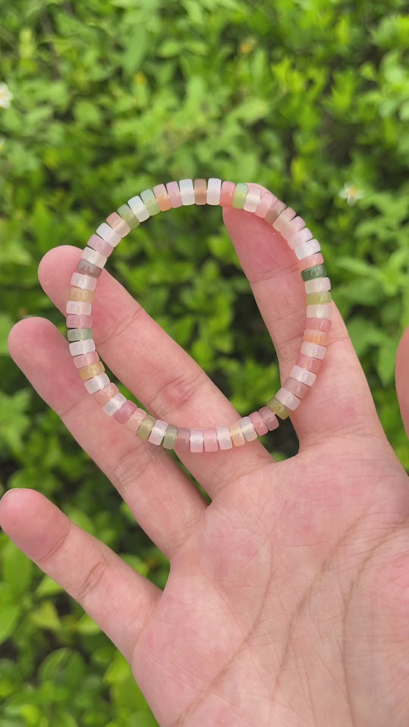 The bracelet features a multi-gem gradient design, blending pastel tones of rose, ivory, green, and honey. This color transition reflects the journey of the heart — from tenderness to self-empowerment. Each bead is precision-cut and hand-polished, creating a smooth, luminous finish that enhances both comfort and brilliance.