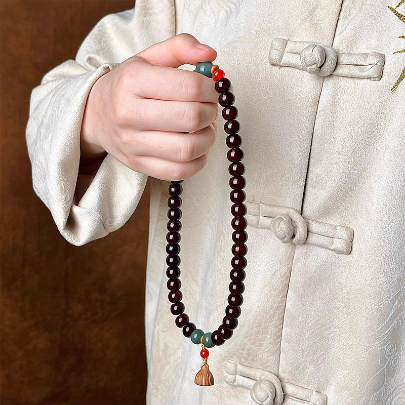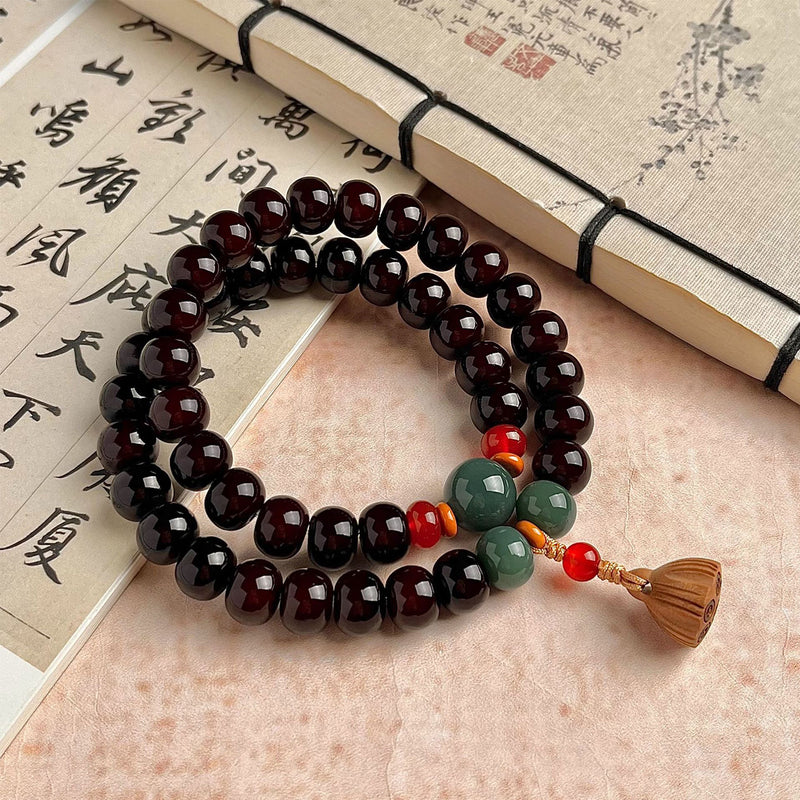 - Material: Red Sandalwood (or Agarwood-Inspired) Beads, Stone-Like Accent Beads, Hand-Carved Wooden Lotus Tassel
