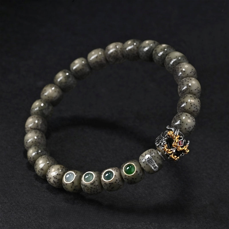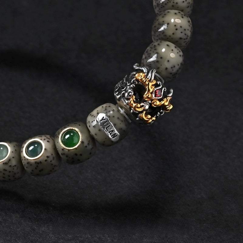 This beautifully coordinated bracelet showcases carefully selected Star Moon Bodhi seeds with the distinctive "waxy ice" quality that gives them a semi-translucent, luminous appearance. The main beads are complemented by a full set of decorative accents including precisely matched spacer beads, traditional decorative elements, and the central Dragon Child charm that adds a touch of mythical wonder. Each component is chosen for both aesthetic harmony and spiritual significance, creating a complete and balanced jewelry piece that feels substantial yet comfortable for daily wear.